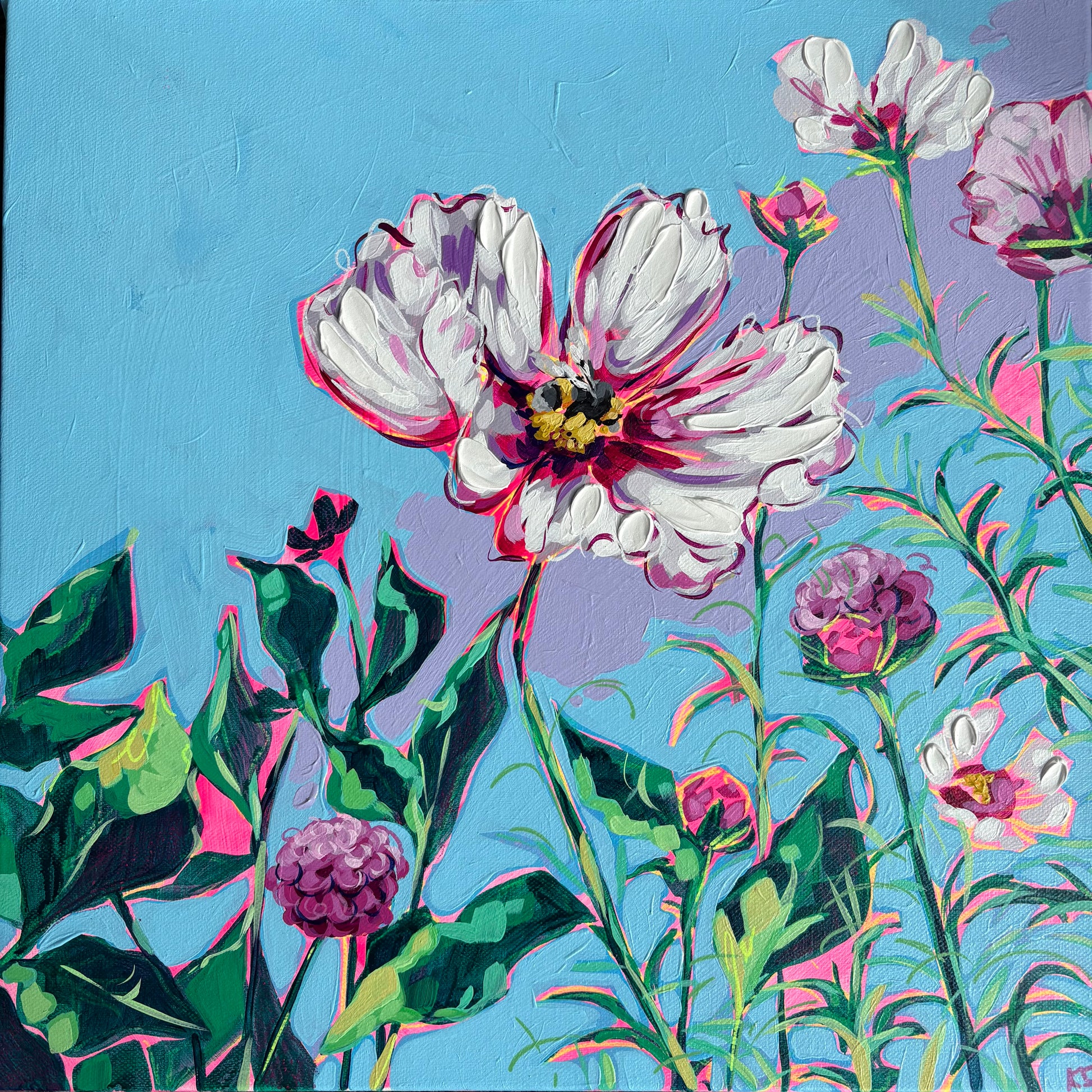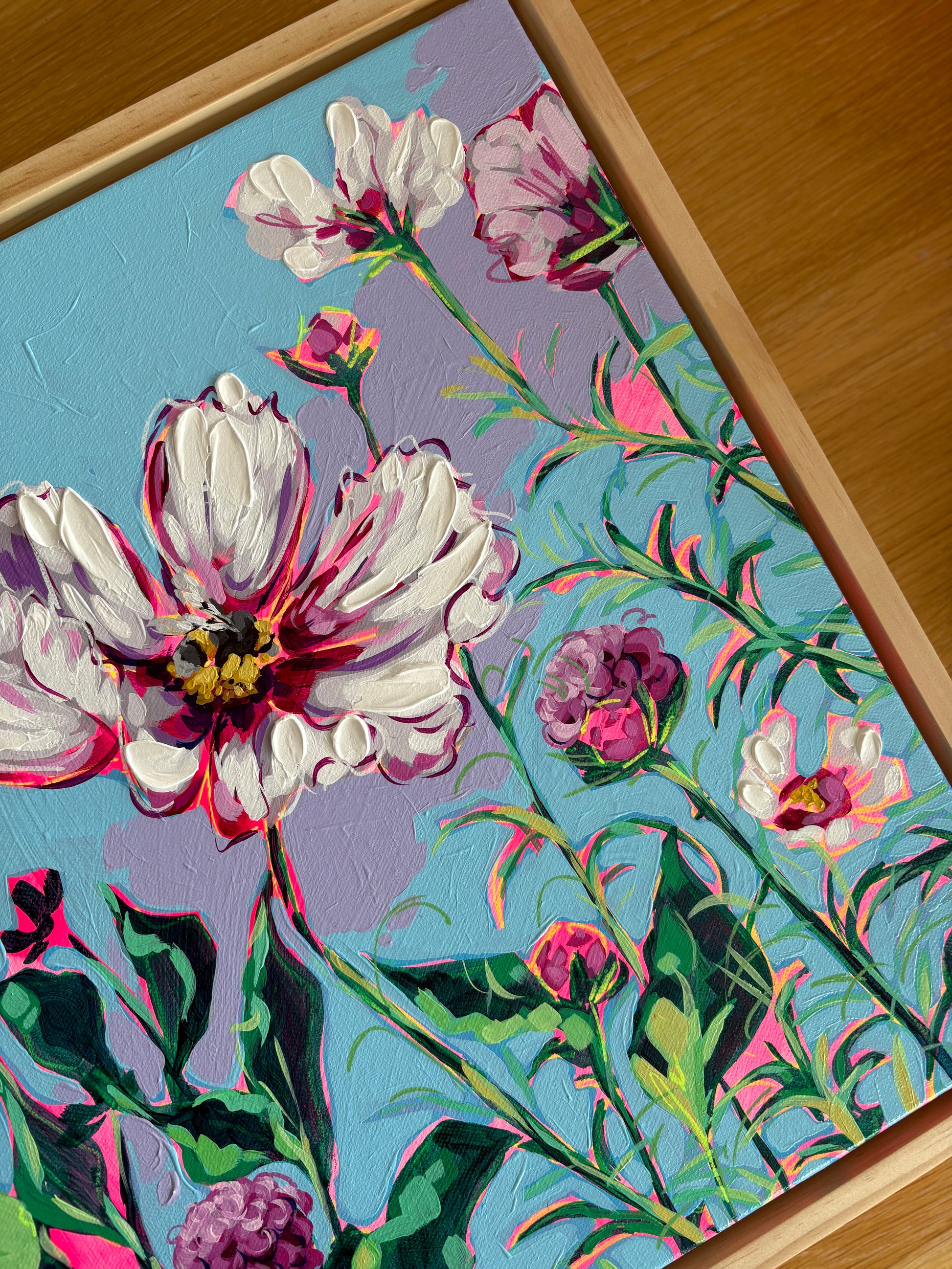 Mixed media artwork including artist grade acrylic washes, texture paste, acrylic pens, oil pastel and oil paint.
