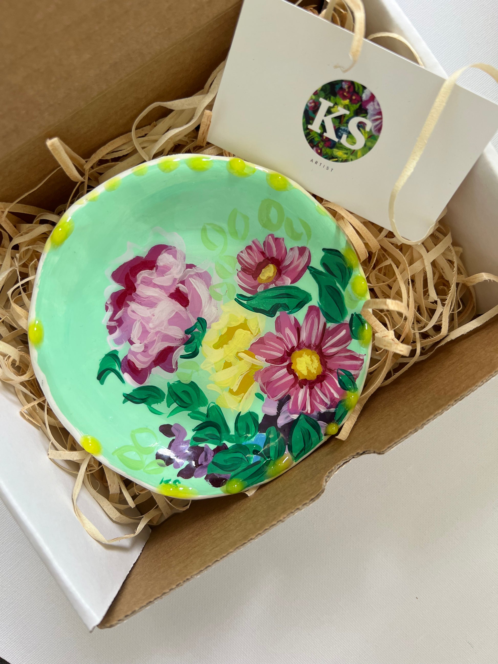 Hand made and painted trinket dish, approximately 12cm in diameter