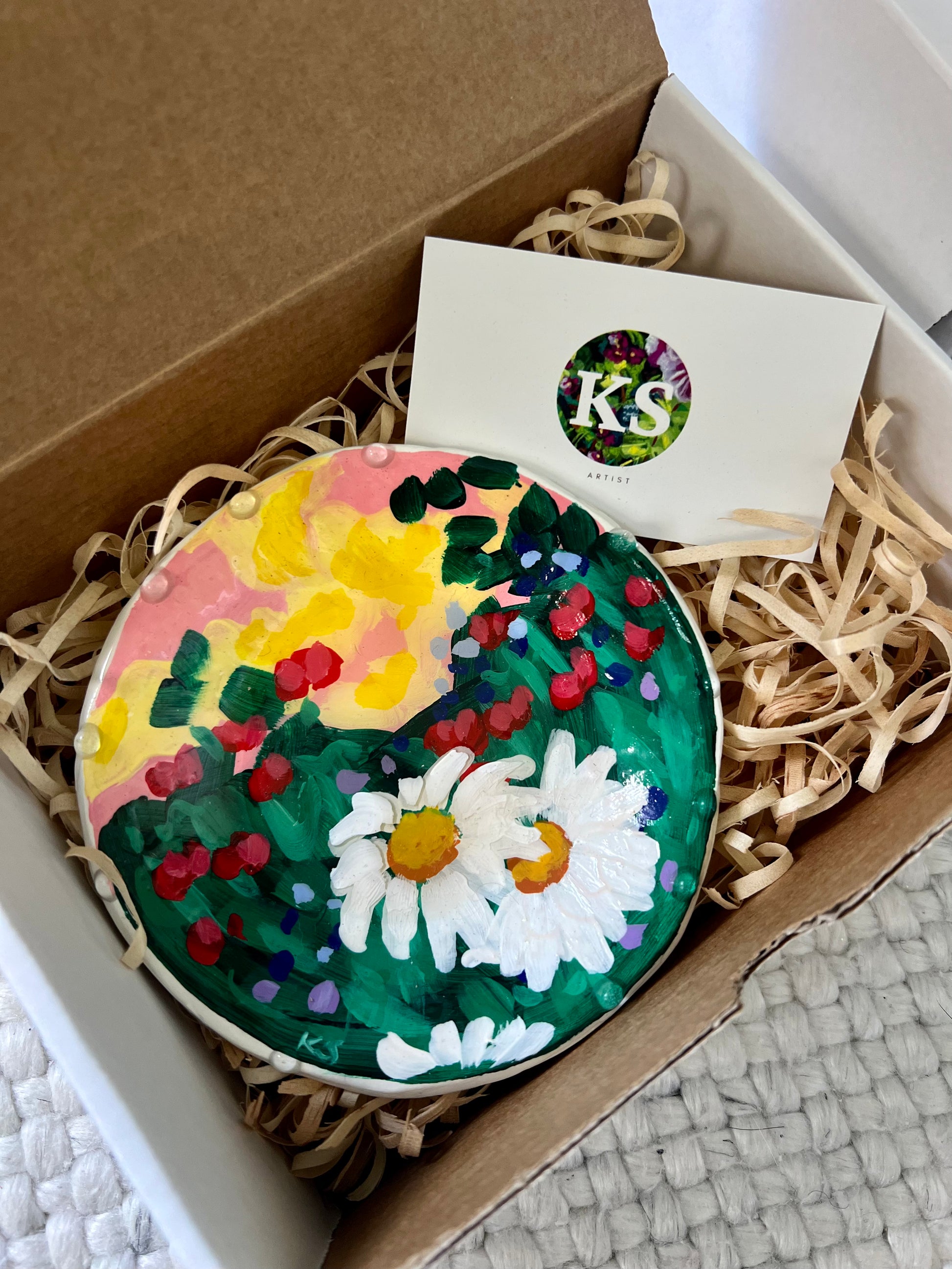 Hand made and painted trinket dish, approximately 12cm in diameter